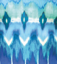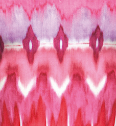 Los motivos inspirados en el ikat —con ritmos ondulantes y elementos romboidales estilizados— se disponen en formaciones de rayas de escala media, con un sutil degradado que aporta suavidad y movimiento visual. Este estampado es uno de los momentos más emocionales de la colección, lleno de energía y luz.