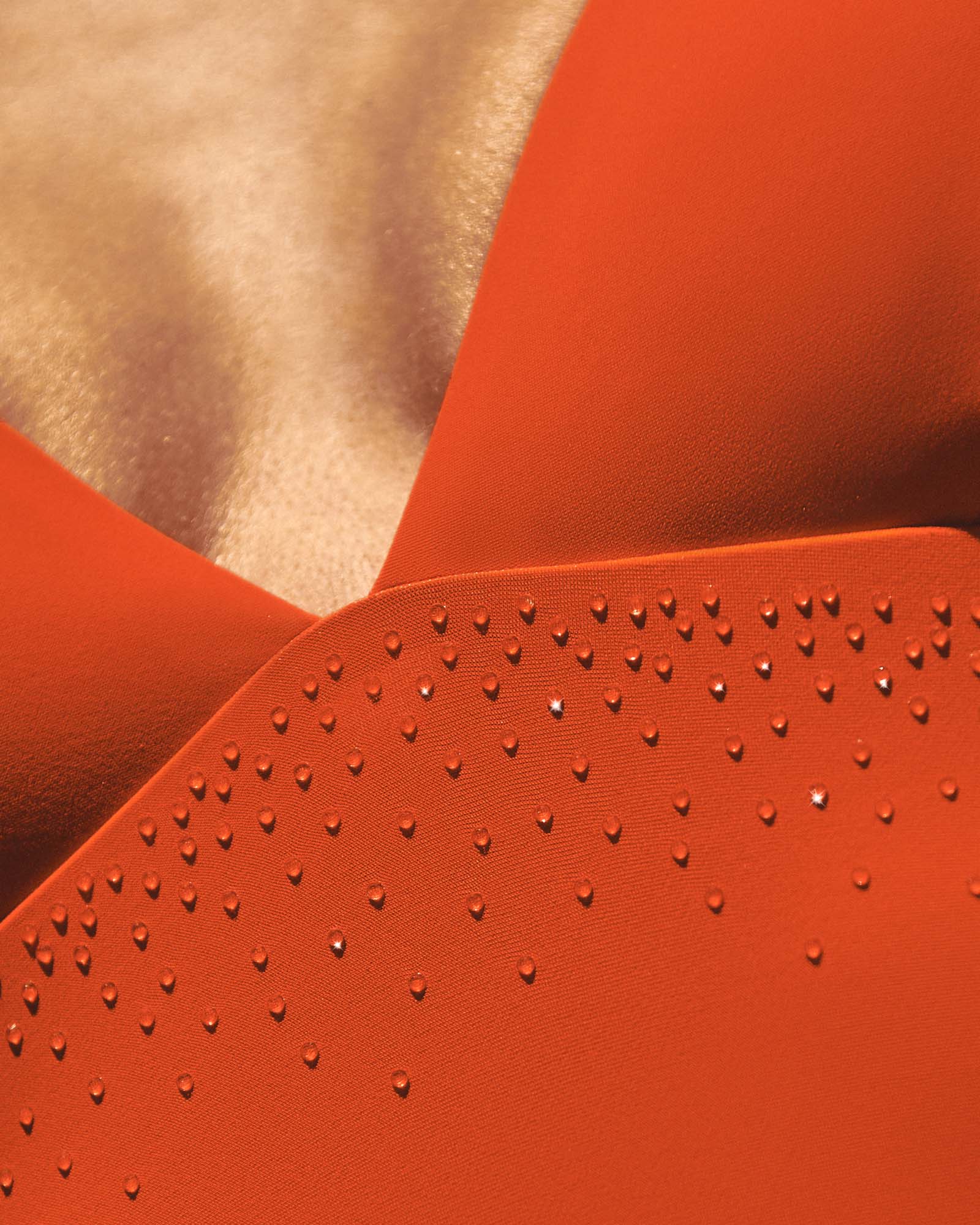 Está confeccionado en un tejido suave, adaptable y de secado rápido, en tonos azul y naranja. El diseño se completa con pequeñas aplicaciones brillantes que evocan cristales, aportando un acabado sutil, elegante y resistente.