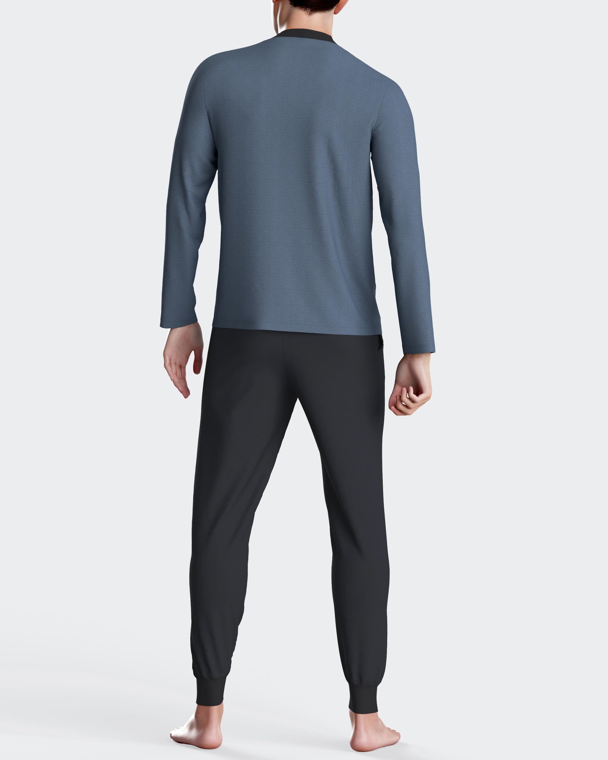 Pijama largo de punto cardado 100% algodón. Compuesto por una camiseta de manga larga con cuello de pico y sutil micromotivo jacquard, y un pantalón liso con cintura elástica, puños en los tobillos y prácticos bolsillos laterales.