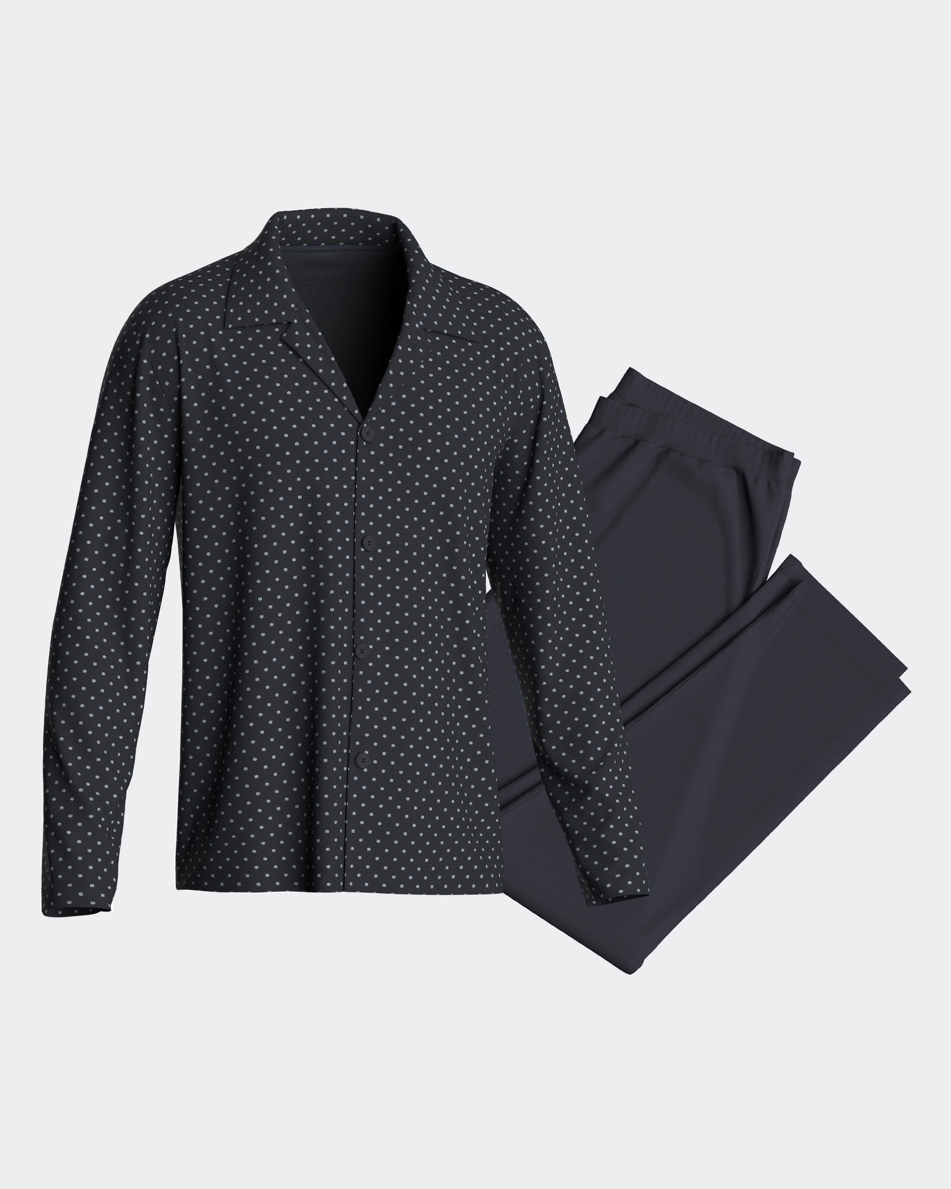 Pijama largo de punto cardado, con camiseta de estilo camisero abotonada y discreto micromotivo estampado. El pantalón liso, confeccionado en 100% algodón, incorpora bolsillos laterales para mayor comodidad.