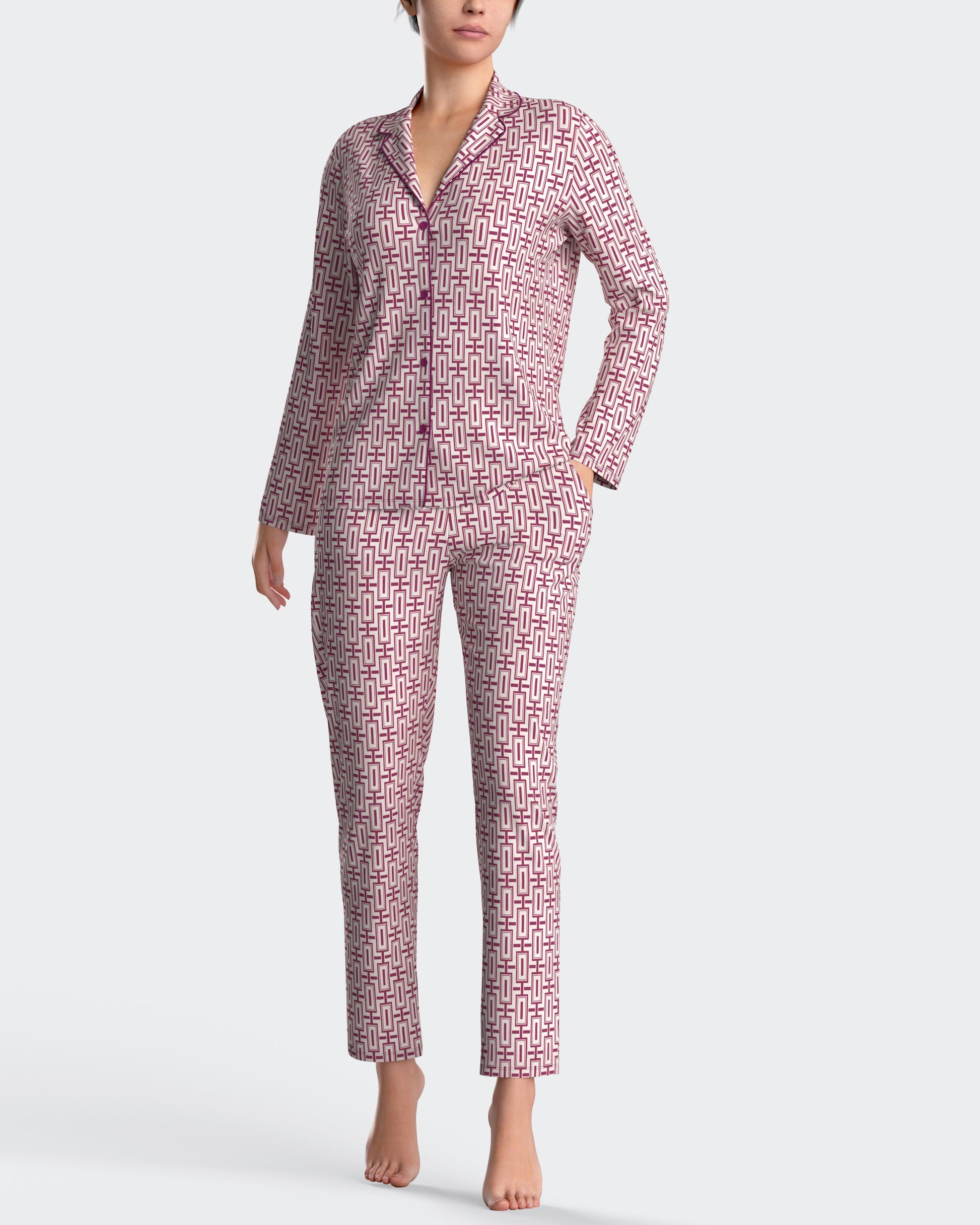 Pijama estilo camisero con estampado geométrico, formado por camiseta de manga larga con botones delanteros y pantalón con bolsillos laterales. Confeccionado en algodón y fibra TENCEL™ Modal, reconocida por su suavidad natural y tacto sedoso.