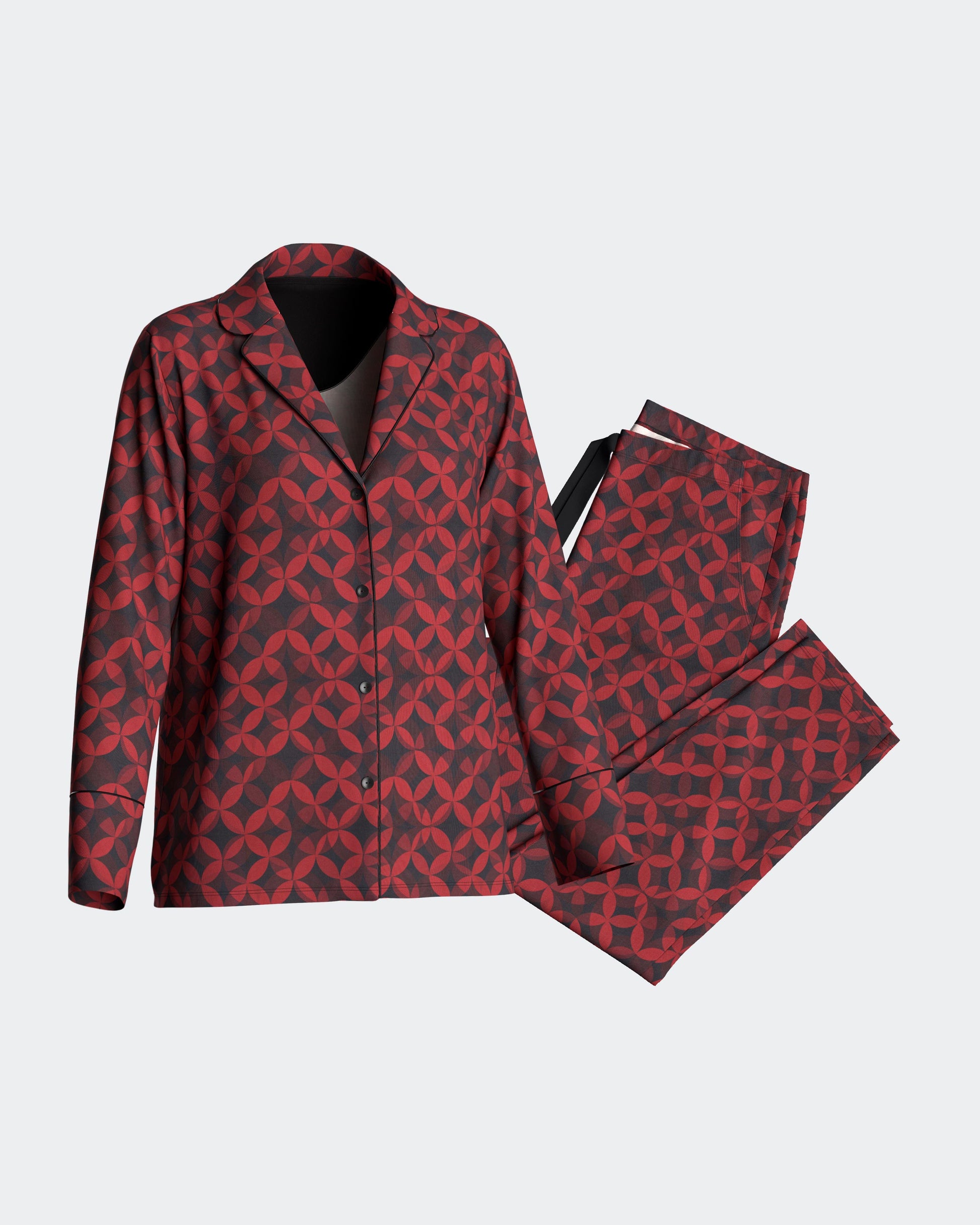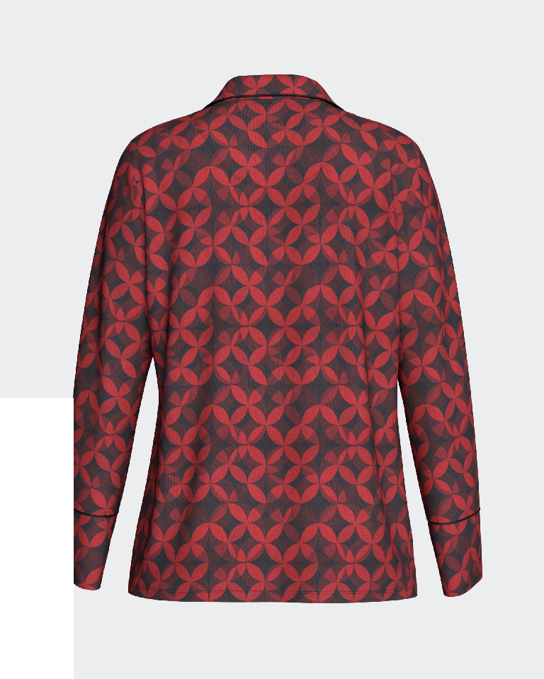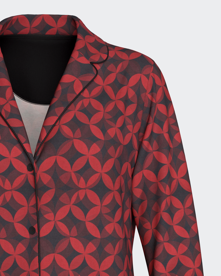 Pijama tipo camisero, formado por camiseta de manga larga con botones frontales y pantalón con estampado de cuadros. El pantalón incluye prácticos bolsillos laterales y cordón ajustable. Confeccionado en malla de doble cara: el exterior en poliéster reciclado ofrece confort térmico, durabilidad y colores que se mantienen vivos lavado tras lavado; el interior en TENCEL™ Modal, fibra natural, brinda suavidad, confort y bienestar.