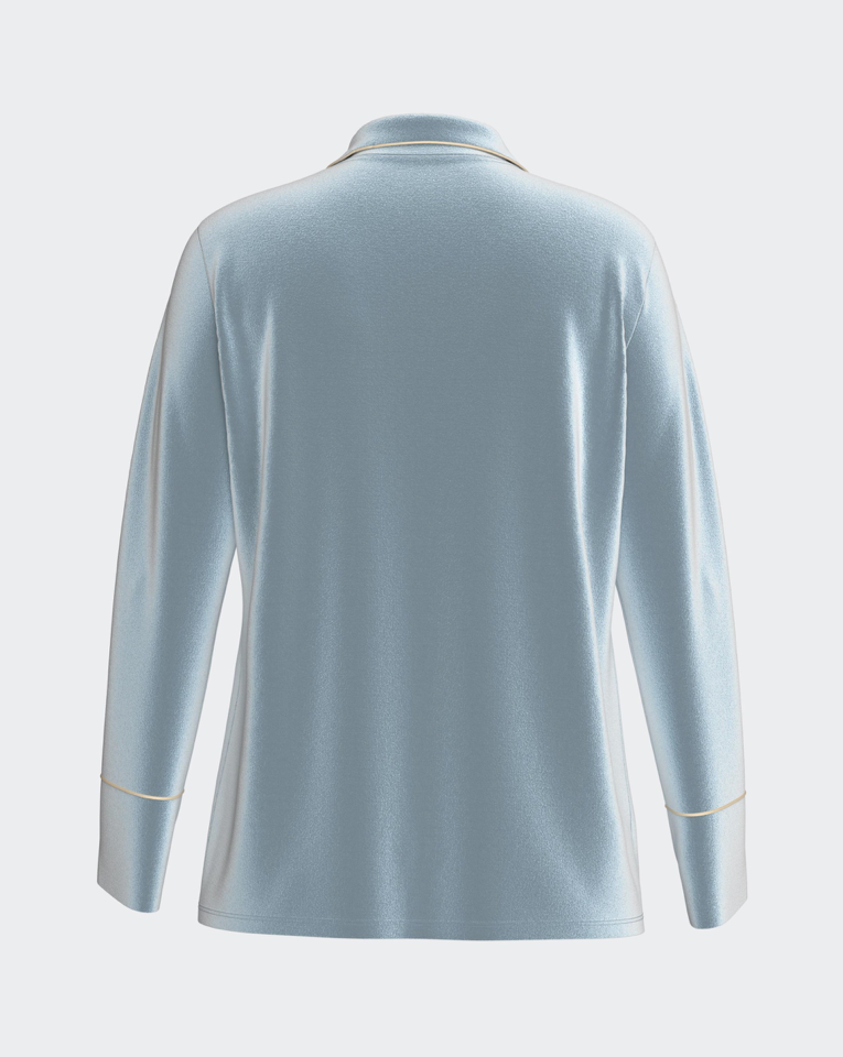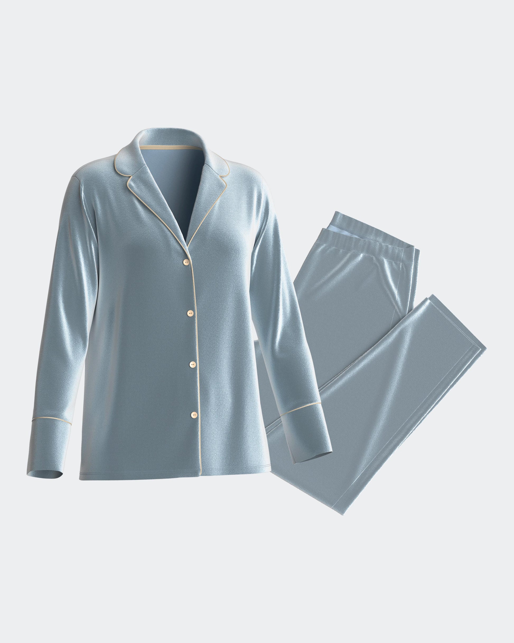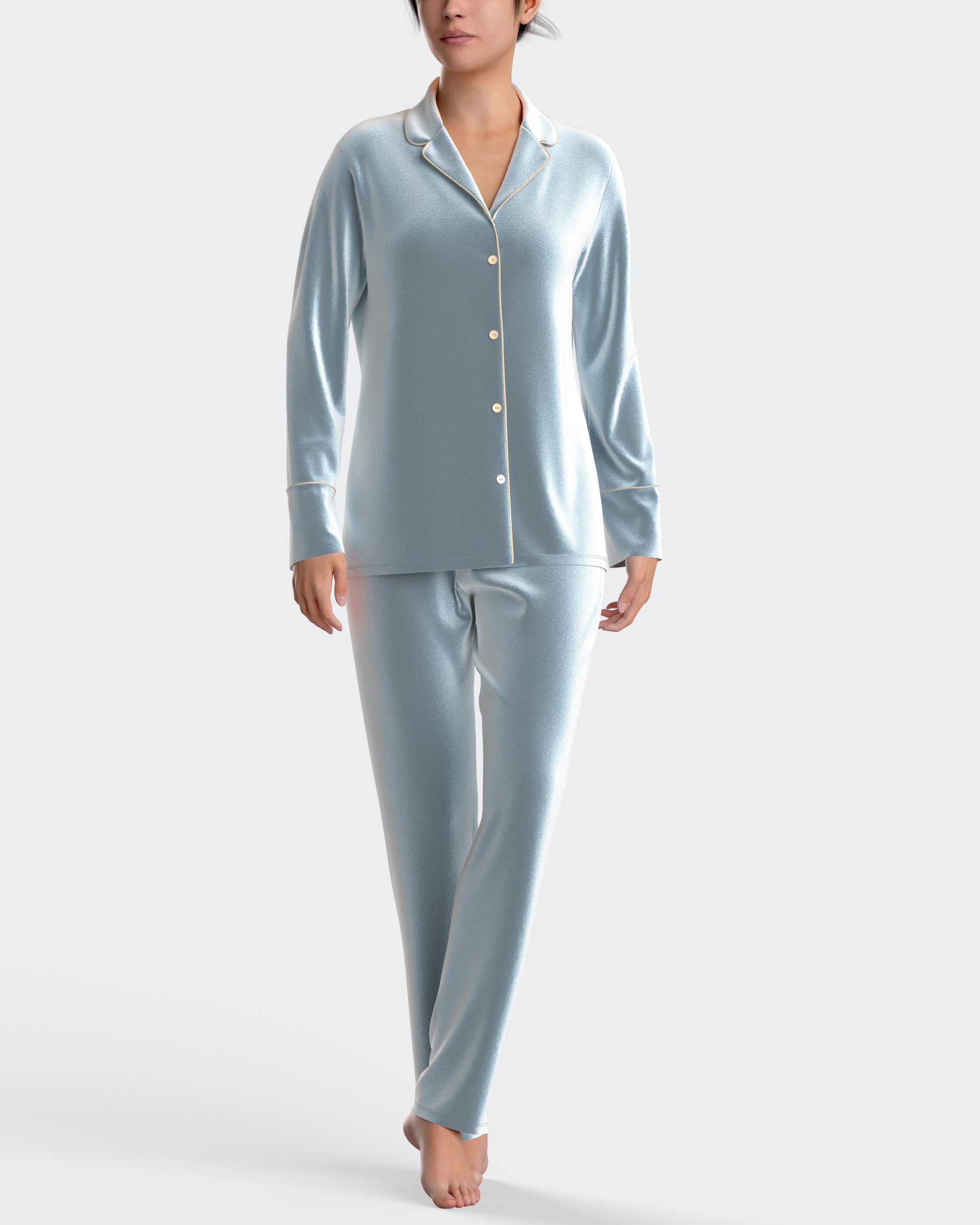 Pijama largo de terciopelo estilo camisero, formado por jersey abotonado y pantalón liso. Confeccionado en tejido de doble cara, con algodón en el exterior para un tacto suave y agradable, y carda de poliéster en el interior que ofrece un eficaz aislamiento térmico.