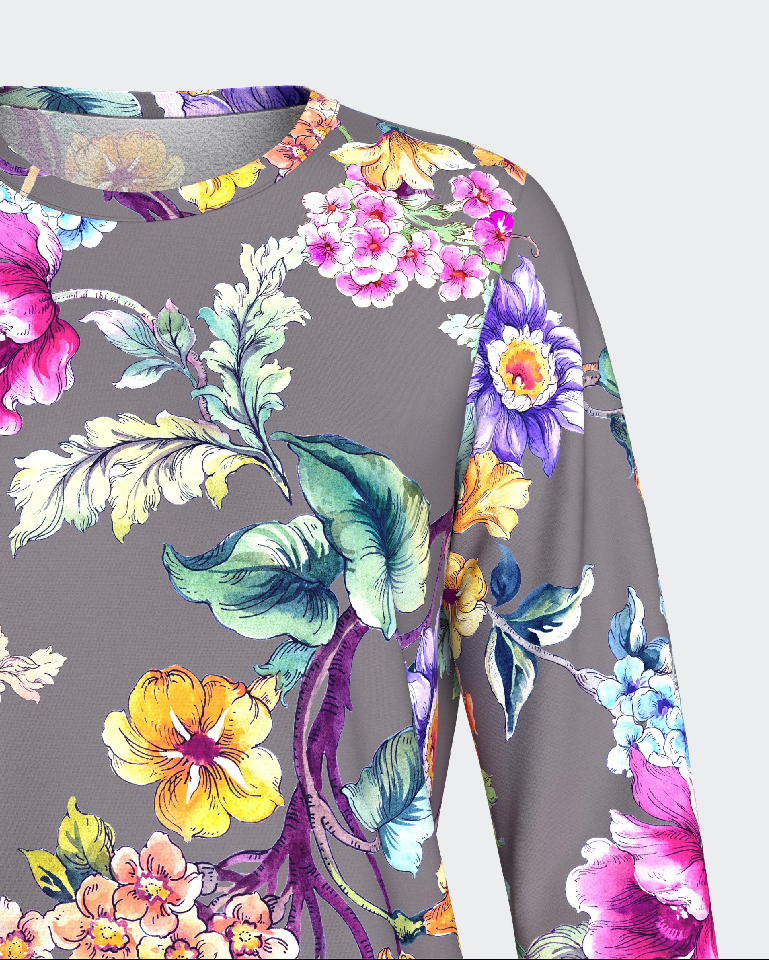 Pijama largo de punto cepillado, compuesto por camiseta de manga larga con estampado floral y pantalón liso con bolsillos laterales. Confeccionado en una suave mezcla de algodón y fibra TENCEL™ Modal, conocida por su tacto sedoso y suavidad natural.