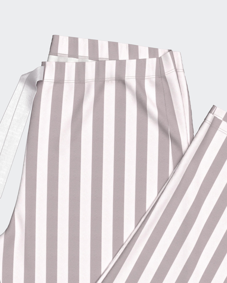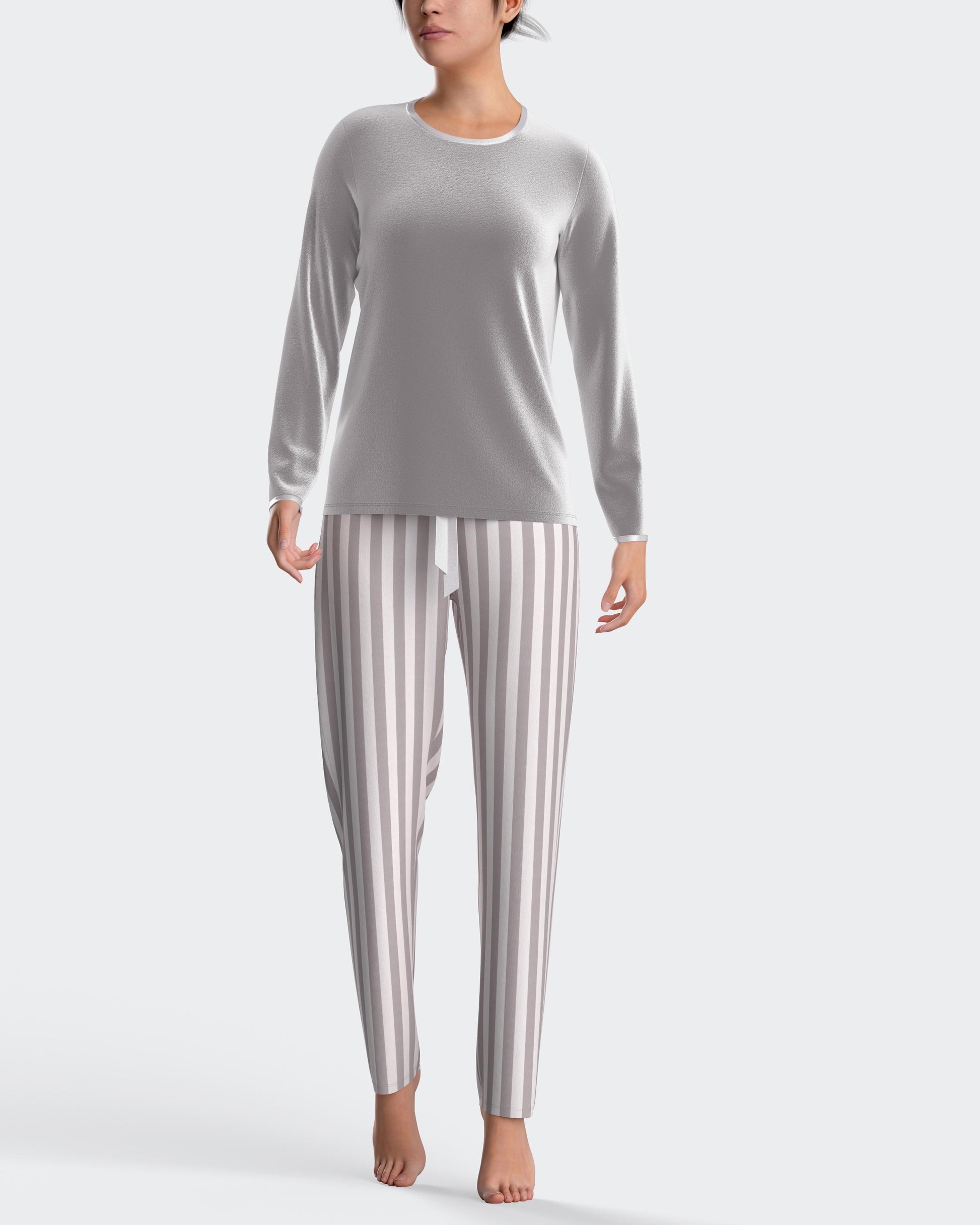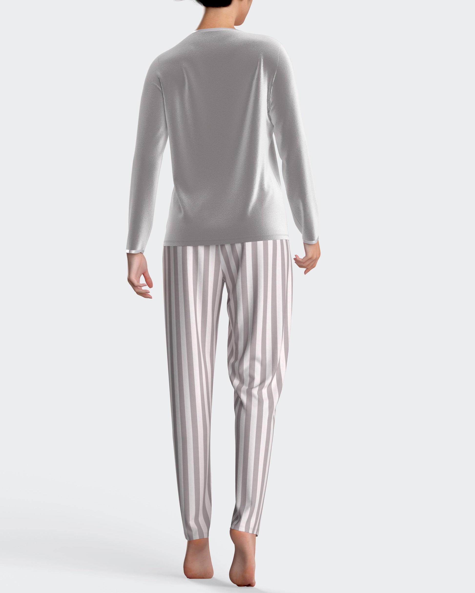 Pijama largo de terciopelo, compuesto por camiseta lisa y pantalón de rayas con cordón ajustable. Confeccionado en malla de doble cara de algodón y poliéster: el exterior, en algodón, ofrece un tacto suave y confortable, mientras que el interior, con carda de poliéster, actúa como aislante térmico para una mayor sensación de abrigo.