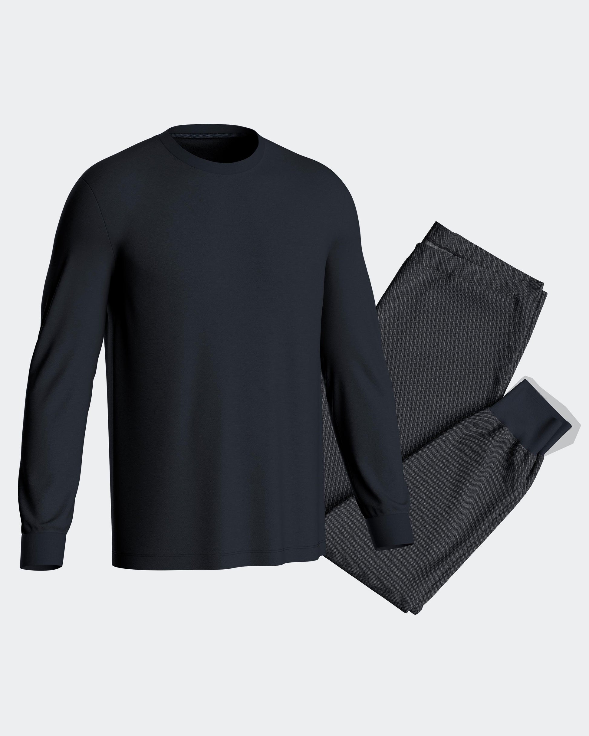 Pijama largo térmico para hombre, perfecto para el invierno. Incluye camiseta de manga larga y pantalón liso con un discreto estampado jacquard, puños en los tobillos y bolsillos laterales. Confeccionado en punto cardado cálido y suave, en una mezcla de algodón y poliéster que proporciona confort y excelente retención del calor.